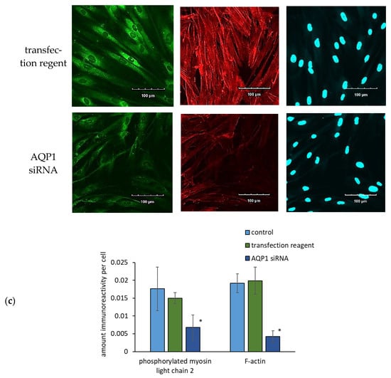 2.4. Measurement of AQP1, Phosphorylated Myosin Light Chain 2, F-Actin, abLIM1, Fibrillin 1, and Type I Collagen Staining after AQP1 Depletion by AQP1 siRNA