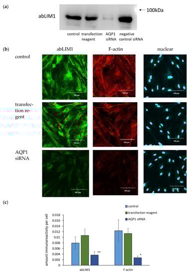Human dermal fibroblasts were cultured in untreated medium (control), medium with the transfection reagent, or medium with AQP1 siRNA for 3 days. Human dermal fibroblasts cultured with AQP1 siRNA showed lower amounts of abLIM1 than the control cells, those cultured with the transfection reagent, or those cultured with the negative control siRNA (Figure 5a).