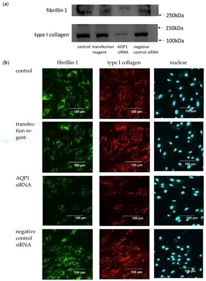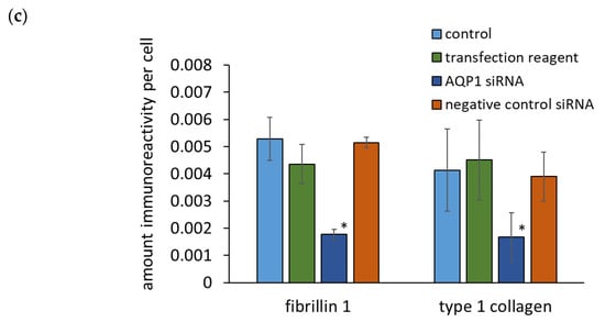 (a) Western blotting for fibrillin 1 and type I collagen in cultured human dermal fibroblasts following AQP1 depletion by AQP1 siRNA. (b) Antibody staining for fibrillin 1 and type I collagen in cultured human dermal fibroblasts after AQP1 depletion by AQP1 siRNA. (c) Image analysis of the amount of immunoreactivity per cell using ImageJ. *: p < 0.05 vs. the transfection reagent. The figure shows the means ± standard deviations (n = 3).