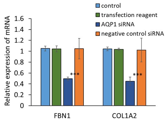 mRNA expression levels in cultured human dermal fibroblasts after AQP1 depletion for 2 days by AQP1 siRNA. ***: p < 0.001 vs. the transfection reagent. The figure shows the means ± standard deviations (n = 3).