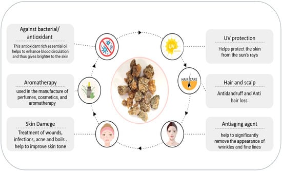 Commiphora myrrha is used to treat wounds, infections, acne, boils [,], hair, and the scalp [,]. It has been used to manufacture perfumes and cosmetics and used in aromatherapy []. The extract affected chapped and irritated skin types [] and improved skin tone, firmness, and elasticity [], and had a UV protection effect [] (Figure 3).