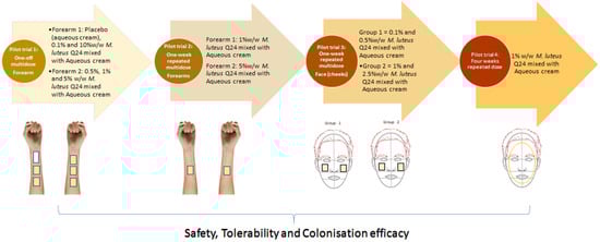 The primary aim of the present studies was to evaluate the preliminary tolerability, safety and potential efficacy of M. luteus Q24 in healthy adult subjects following the topical application of cream and serum formulations containing M. luteus Q24 in different doses, durations and body sites (forearm and face). Safety considerations also included the in vitro testing of M. luteus Q24 for haemolytic activity and for its susceptibility to a relevant series of therapeutic antibiotics.