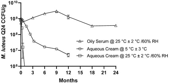 Several topical formulations were prepared using different concentrations of M. luteus Q24 in either aqueous cream or oil serum. In both the aqueous cream and oil serum samples, one hundred percent of the M. luteus Q24 inoculum (as CFU/g) was detected, confirming that the analytical sampling method was suitable for M. luteus Q24 enumeration in both formulations. The count of M. luteus Q24 in the 1% w/w oil serum formulation was found to be stable at 25 °C/60% relative humidity with <0.25 log reduction in the cell count detected after 24 months (Figure 2). This established that the levels of M. luteus Q24 in this formulation were retained throughout the study period. On the other hand, the M. luteus Q24 in aqueous cream had a relatively poor shelf life at room temperature, with ≥3-log reduction occurring within 1 month and even under refrigerated storage with ≥1.4 log reduction within 3 months and ≥2.2 log reduction after 12 months, the formulation was therefore not considered commercially viable and no further data points were collected. The presence of preservative agents in the aqueous formulations was considered to have rendered these preparations unsuitable for retention of M. luteus Q24 viability.
