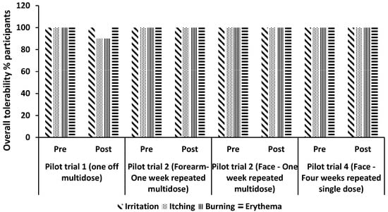All subjects were asked to document if they experienced irritation (stinging, tingling, redness), itching, burning or erythema associated with the use of the preparations. A four point scale of 1 = none, 2 = slight, 3 = moderate, 4 = severe was implemented.