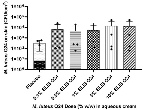 Analysis of the skin swab samples showed that an increase in the level of M. luteus Q24 in the formulation resulted in a corresponding increase in its colonisation within the skin microbiota (as represented by the relative numbers of M. luteus Q24 colonies) (Figure 4). In comparison to the placebo, a non-significant but 2 to 6-fold increase in the colony counts of M. luteus Q24 was observed. A clear dose–response effect was confirmed by a linear correlation (r2 = 0.90) between M. luteus Q24 dose and M. luteus Q24 colonies on the forearm.