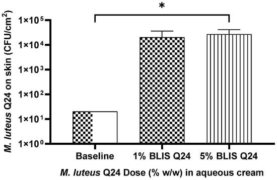 Influence of M. luteus Q24 dosage level on the subsequent colonisation levels of the probiotic detected 24 h post last dose following one week pre sleep application on the forearms of adult participants (n = 11). Data points are means ± SD. Only groups showing a significant difference (p ≤ 0.05) are indicated with * on the graph.