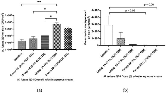 In addition to the enumeration of M. luteus Q24-like colonies, the skin swab samples were also tested for presumptive staphylococci by plating on Mannitol—salt agar (a selective medium for the isolation and identification of S. aureus). No specific follow up S. aureus identification steps were however carried out. The use of this medium also facilitated the differentiation of M. luteus Q24 colonies from those of Staphylococcus sp. Interestingly, a weakly significant difference was observed for the groups applying 1% and 2.5% M. luteus Q24 in that they exhibited a reduction in presumptive staphylococcal counts compared to baseline, with a strong correlation between dose and the decline in the presumptive pathogenic staphylococcal counts (r2 = 0.94) (Figure 6b).
