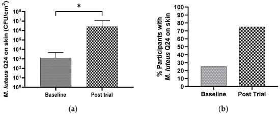 Effect of M. luteus Q24 serum formulation (1% w/w) on the (a) detection levels of M. luteus Q24 like colonies and (b) percentage of participants colonized 24 h post the last dose of twice daily application for 4 weeks on the face of adult participants (n = 13). Only groups showing a significant difference (p ≤ 0.05) are indicated with * in the graph.