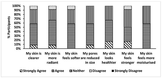 The participant survey (Figure 8) indicated that more than 67% considered there to be an improvement in their skin appearance, with comments including that their skin looks more radiant, healthy and hydrated. A majority (58%) of the participants observed a reduction in pore size, skin clarity and enhanced skin softness. Although no quantitative measurements were obtained, these responses were considered to be encouraging and were consistent with the parallel assessments made of the safety of strain Q24, its tolerability and the skin quality improvement rendered by its topical application.