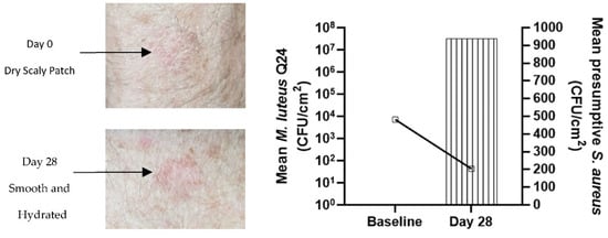 Improvement in the appearance of dry scaling patch on the forearm (left) and increase in M. luteus Q24 count and decrease in presumptive pathogenic staphylococci count (right) after application of M. luteus Q24 oil serum for 28 days.