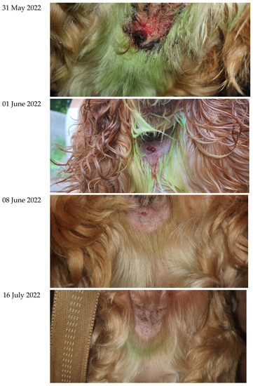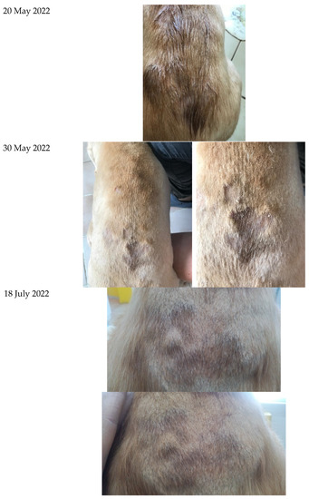 Patient 1. Hair was removed from the affected area. SS® cream was prescribed for application twice a day until healing. The owners did not report any irritation caused by the cream. The treatment lasted for 30 days, and on the 20th day of the therapy, the patient comes for a control examination. There was no erythema and desquamated skin. A total of 49 days after the beginning of the therapy, complete restoration of the hair cover in the affected area was noted. Particularly striking was the darker pigmentation of the hair. The photos (Figure 1) show subcutaneous formations that are age related.