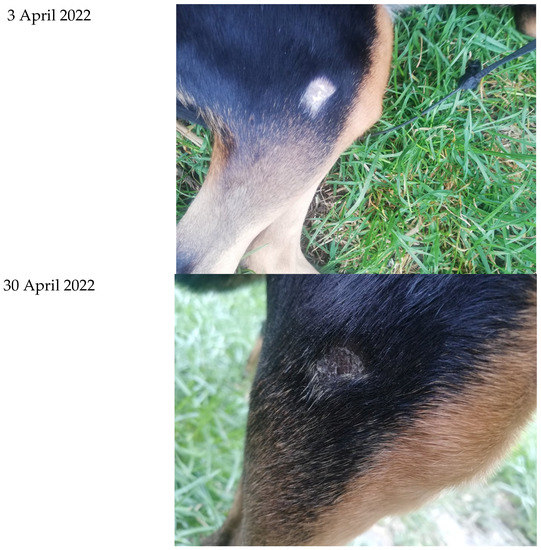 Patient 3. SS® cream was applied twice a day for 10 days. At the end of the therapy, a decrease in the diameter and a darkening in the pigmentation of the skin in the treated area (Figure 3) was observed. The condition started 15 months ago without any signs of improvement so far. Owners report no irritation caused by the cream.
