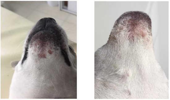 Patient 4. Dog. Male. There are no data for accompanying diseases. On a routine examination, severe inflammation in the chin area was revealed. The clinical condition was accompanied by severe erythema, folliculitis, multiple crusts, and significant alopecia in the area (Pyoderma superficialis). By the microbiological examination, a mixed staphylococcal infection with a predominance of Staphylococcus schleiferi was shown.