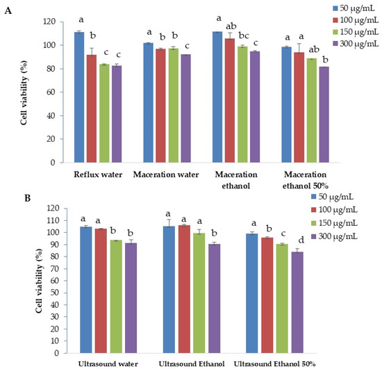 Cell viability (%) evaluation using resazurin assay for Arbutus unedo extracts obtained by reflux and maceration (A) and ultrasound (B) extraction on RAW 264.7 cells. Cells were incubated, for 24 h, with 50–300 μg/mL extract. The percent cell viability was determined by comparison to the untreated control. Data were displayed as mean ± SD calculated from triplicate results. For each extraction method, different letters between extract concentrations mean significant differences using Duncan’s test at a 0.05 probability level.