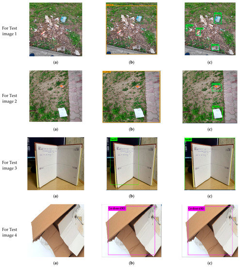 Experimental results of object detection for waste segregation on various test images (a) original image (b) detection by YOLOv3-tiny (c) detection by YOLOv3.