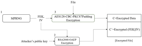 Folders at the same depth are searched and infected in ascending order of their folder names. Next, files in the same folder are preferentially infected in ascending order of their file names. File encryption by Magniber v2 proceeds in three steps: file encryption key () and generation, and encryption and file encryption. These steps are applied to each target file. Each step of the Magniber v2 file encryption process is presented in Figure 2 and described below.