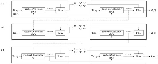 The output of the first RNG (0 or 1) determines the input of the second RNG: if the output is 0, the second RNG’s input is ‘a’ and ‘z’; otherwise, its input is ‘0’ and ‘9’. The second RNG then outputs a one-byte character between ‘a’ to ‘z’ or ‘0’ to ‘9’. Repeating this process n times generates an n-byte random string. The MPRNG algorithm is given in Algorithm 2.