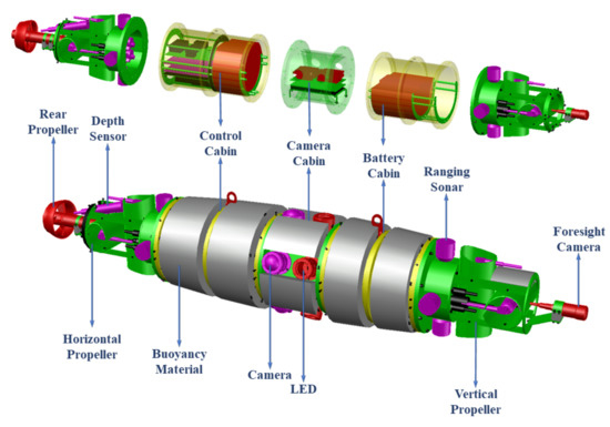 The main body of the AUV-T consists of three watertight compartments—namely, a control cabin, a camera cabin, and a battery cabin—outside which annular buoyancy material is equipped, as shown in Figure 2. The AUV-T is equipped with a main thruster at the stern and two vertical and two horizontal thrusters for the control of surge, sway, heave, pitch, and yaw motion. A high-precision depth gauge and four ranging sonars are equipped in the stern, four ranging sonars are equipped around the bow, and five lights and five HD cameras are equipped in the camera cabin in a circular distribution. The cameras are mainly responsible for shooting the video of the wall in the tunnel. The brightness of the lights is adjusted by a PWM (pulse width modulation) signal to provide a light source for the camera. In addition, a forward-looking camera is equipped at the bow of the AUV to recognize the optical signals of the branch hole and assist the AUV in exiting the hole.