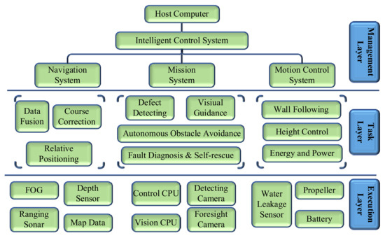 - This paper designed a system structure suitable for a water conveyance tunnel inspection AUV. The task layer includes ten task modules: data fusion, course correction, relative positioning, wall defect detection, autonomous obstacle avoidance, visual guidance, fault diagnosis and self-rescue, wall following, height control, and energy and power. It can adapt to the harsh environment in a water conveyance tunnel and realize the detection of the tunnel.