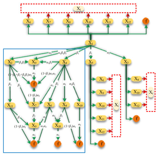 Because the two CPUs have different models and working loads, the probability of failure is different. On the other hand, the communication mechanism between the serial line and the network determines that the probability of failure is different. is the constant failure rate of computer1, is the constant failure rate of computer2, is the constant failure rate of the serial line, and is the constant failure rate of the network line. is the process states of Markov. is the initial normal working state of the system. are the state of a single CPU failure. are the state of a single communication line failure. is the state in which both communication lines have failed. are the state in which both a computer and a line have failed. is the state in which both a computer and two communication lines have failed. is the state of a fatal failure of the system. Among them, belong to the normal working state, and belong to the communication failure state. Figure 7 shows the transition probability and transition process between each state . The blue box on the left completely displays the transition probability and transition process between some states. The state transition process in the red dashed frame on the right and upper side is similar to that on the left, so it is omitted.
