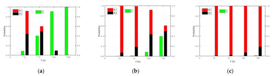 In order to verify the reliability of the heterogeneous dual-line dual-CPU hot redundancy system, let take different values. As far as we know, there is no accurate value for the failure rate used in this paper. Therefore, the failure rate is set in accordance with empirical values and other papers [8]. In order to ensure the reliability of the data, we appropriately increased the failure rate in the paper. When takes a different value, the values of change accordingly. According to Equations (16)–(20), we could calculate the probability of the system in different states under different working hours. The results are shown in Table 2. In Figure 10a–c represent three failure rate states from high to low respectively.