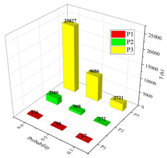 On the other hand, the working hours of the system under different fatal failure probability can be calculated, as shown in Table 3. The results are shown in Figure 11.