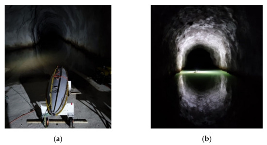 In order to verify the AUV-T’s ability to detect tunnels and the reliability of the system, we used the AUV-T to conduct an automatic inspection of a water conveyance tunnel in Hangzhou, Zhejiang Province, China, in August 2019, as shown in Figure 12. Figure 12a is AUV-T. In Figure 12b, AUV-T was sailing in the tunnel. The length of the water conveyance tunnel is about 4 km. The sailing time of the AUV-T is 90 min, and the average speed is about 0.74 m/s.