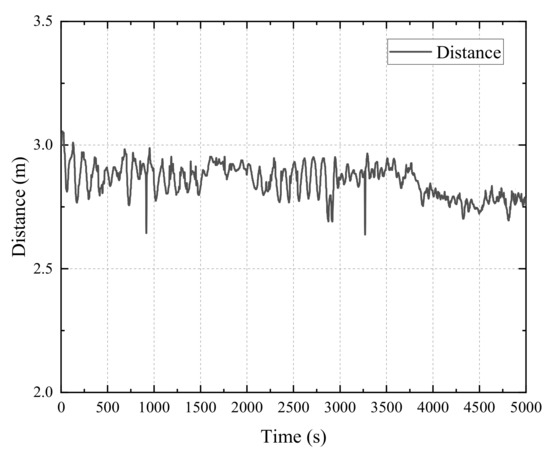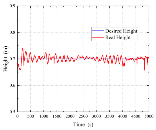 It can be seen that the AUV-T can successfully detect the tunnel. During the selected sailing time, the AUV-T maintained a heading angle of about 75°, and the overshoot was less than 5°. At 4000 s, due to the change in the tunnel direction, the AUV-T realized the automatic adjustment of the heading angle after recognizing the tunnel direction change. On the one hand, the distance between the AUV and the bottom of the tunnel was always stable at 0.7 m, and the height fluctuation was less than 0.1 m. Using the controller proposed in this paper, the AUV-T could maintain a stable heading and height during the sailing in accordance with instructions to ensure the stability of the AUV-T during sailing, so as to realize the autonomous observation of the tunnel.