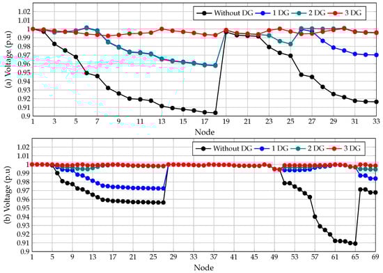 - The inclusion of the reactive power capability of the DGs significantly improves the total power losses minimization regarding the unity power factor case. For example, for the case of three distributed generators, the total power loss passes from kW to kW; while for the 69-nodes, this change is from kW to kW.