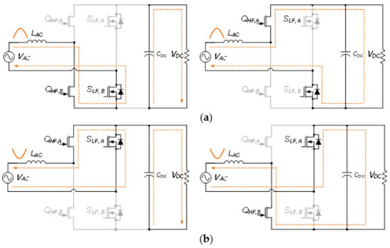 where dhf and dlf are the duty cycles of the high-frequency and low-frequency legs, respectively. Specifically, in the positive half cycle of the AC voltage, QHF,B and QHF,A function as the main and synchronous switches, respectively; in the negative half cycle of the AC voltage, they operate in reverse. Figure 2a shows the power flow according to the switching operation during the positive half cycle of the AC voltage, and Figure 2b shows that in the negative half cycle.