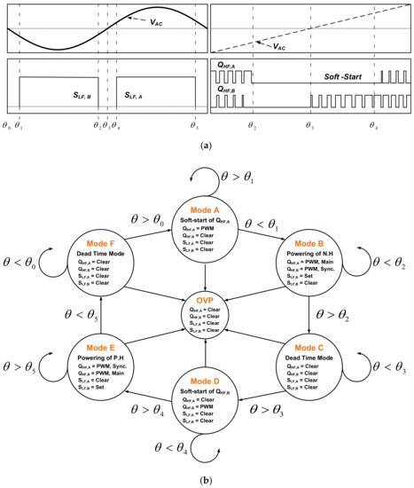 As shown in Figure 7a, the digital control algorithm of totem-pole PFC is implemented by dividing it into six modes based on AC voltage period. As described, the setting of the action qualifier changes according to the AC voltage polarity; hence, it is complementarily controlled in three modes. The state machine for each mode of operation is shown in Figure 7b.