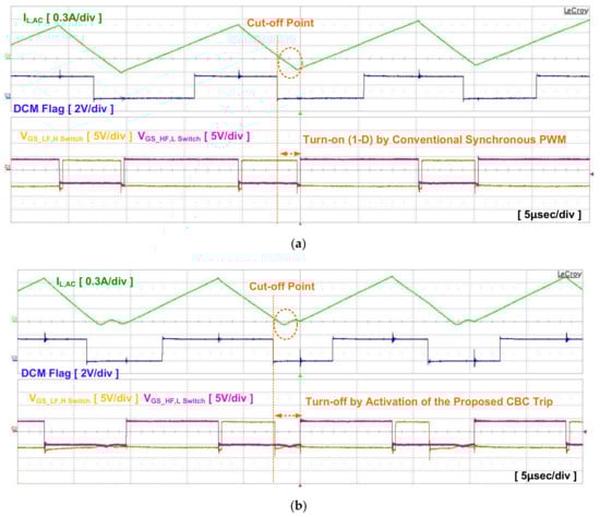 Figure 9b shows the gate waveform of the proposed CBC trip-type synchronous PWM method. When the DCM flag is low active, the synchronous switch is turned off by the CBC trip. When the synchronous switch is turned off, the current flows through the body diode. Note that the inductor current is clamped to zero.