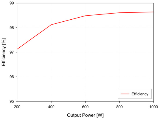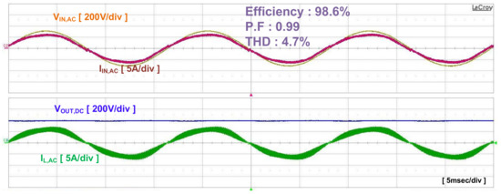 Figure 11 shows the operating waveforms for the input and output under rated conditions. The CBC trip-type synchronous PWM driving technology can stably operate switching at the zero crossing. Figure 12 shows the efficiency characteristics according to the load. Under the 1 kW rated conditions, the following are achieved: 98.63% efficiency, 0.99 PF, and 4.7% THD. Based on the experimental results, the proposed technique, which employs a wide DCM section, exhibits safe performance and high efficiency under light load conditions.