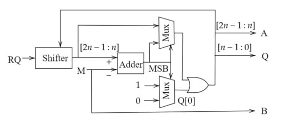 Figure 1 shows the hardware architecture for the restoring division of ASAD-RD, and Figure 2 shows the hardware architecture for the multiplicative division of ASAD-RD. Figure 3 shows the hardware architecture of SAADI. Except for Q and one adder, whose output is the final quotient in the multiplicative division part of ASAD-RD, the hardware architectures of ASAD-RD and SAADI are similar. The proposed design consists of a restoring division part and a multiplicative part. In the restoring division part, if the remainder R, whose initial value is zero, divisor M, and dividend Q are the inputs of ASAD-RD, R and Q are combined as and are shifted one bit left. Subsequently, most n bits of become R. The most significant bit (MSB) of the operation result is the selector of the two multiplexers. If the selector is one, the output of the multiplexers is , and if the selector is zero, and one are the outputs. The architecture consists of a recursive structure in which the output of each multiplexer is returned to its input. This process is repeated for the number of bits of the input. When the restoring division is performed through this process, R, Q, and B are obtained as outputs, and the remainder R and quotient Q have different values from the initial values. However, B receives the value of M, and it remains the initial value. After the restoring division, R and B become the inputs of multiplicative division as a dividend A and divisor B, respectively; in this process, the dividend A gets the value of R. Furthermore, Q is stored and then combined with the results of the multiplicative division to provide the final quotient . This multiplicative division process is the same as the previous design of SAADI. However, for the same operation, the input and output of the multiplicative division are different. Consequently, the existence of the restoring division provides different outputs from the previous design for the same division. Major hardware components for ASAD-RD include one 2n-bit barrel shifter, two n-bit adders, and two 2n bit two to one multiplexers more than those of SAADI. Therefore, ASAD-RD needs as much area as for these components as SAADI, and it is expected that ASAD-RD will consume more power and energy for the same division. The analysis of the power consumption and energy is provided in Section 4.3.