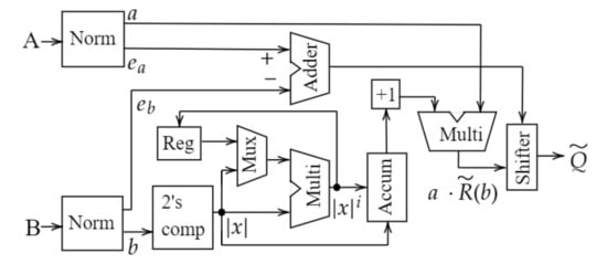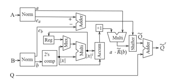 where . It always converges because for normalized b such that . The approximate reciprocal can be obtained by adding up the first few low-order terms. If higher accuracy is required, more order terms can be added to gradually improve accuracy. However, this also improves latency. This trade-off can be used for applications depending on the required accuracy and latency restriction [14]. Let denote the t-th order approximation of , such that: