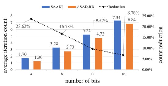 According to Section 4.2, the average number of iterations for maximum accuracy is less than . Then, the average number of iterations of ASAD-RD is approximately 0.5 lower than the previous design. As a result, with the same parameters, the maximum accuracy of ASAD-RD is not only higher than that of the previous design, but also the number of iterations for maximum accuracy is lower. Lower iterations save power, and the amount saved is greater than the additional power consumption due to additional hardware. Therefore, ASAD-RD has advantages over SAADI in power or performance.