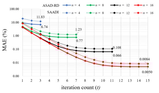 Figure 4 shows the average iteration counts of SAADI and ASAD-RD required to reach the maximum accuracy for n = [4, 8, 12, 16]. In both dividers, the maximum number of the effective iteration counts for improved accuracy is . The average number of iteration counts to reach the maximum accuracy is less than for SAADI. For ASAD-RD, it is approximately 0.5 lower than the value for SAADI. In other words, ASAD-RD has the benefit of reducing the iteration count in the same n. Therefore, ASAD-RD can offset the additional latency for maximum accuracy due to the extended hardware for restoring division.