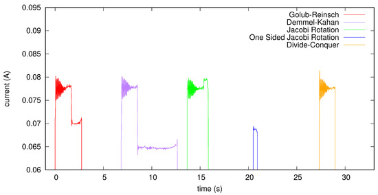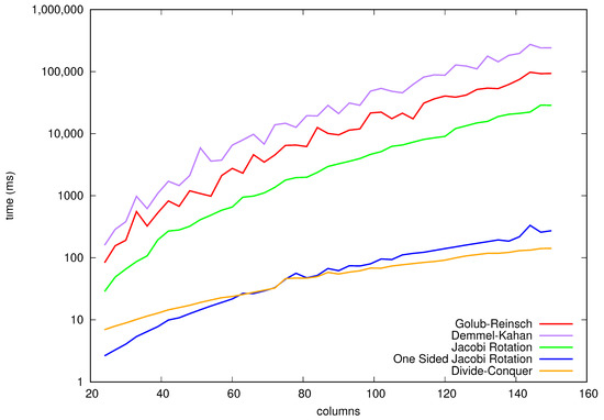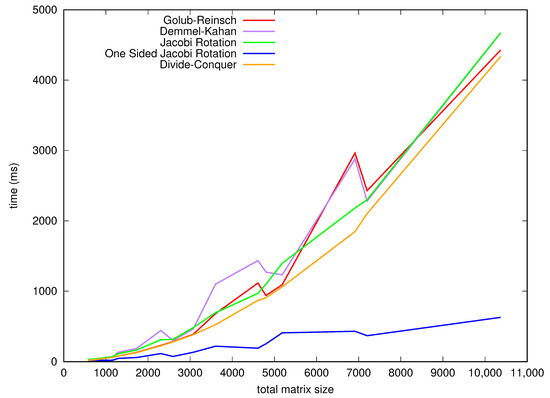 Various algorithms have been developed during the last decades for solving SVD [28], among these Golub–Reisch [29], Demmel–Kahan [30], Jacobi rotation [31], one-sided Jacobi rotation [32], and divide and conquer [33] algorithms are largely used since they guarantee good performance in common applications. An overview of SVD as well as the methods for its computation can be found in [34,35].