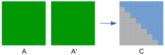 Matrix product of , with A upper-diagonal. Green = cells used in computation, blue = cells to be computed, grey = duplicated cells.