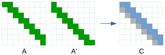 A further reduction of the number of operations is possible in the case of where A is an upper-diagonal matrix, another common case in the given algorithms. Given that only for or , from (15) follows that only for , i or (indeed the resulting matrix is tridiagonal) and that the only non-zero terms in the sum are those for which and are both non-zero. The resulting formula is: