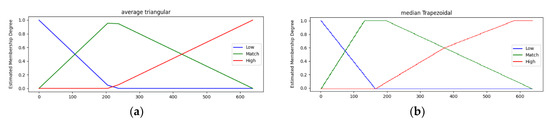 To estimate the fuzzy membership function, it is necessary to set an appropriate category for the input value and the result value. We basically define the result value as a value that indicates how well the input condition meets the criteria indicated by the If–Then rule. For the input value, three categories of high, match, and low were constructed by calculating the reference point according to the constant value estimation method. Based on the results of extracting the five characteristics specified in Table 2 from the data learned for the generation of membership functions, two methods to estimate high and low membership were defined: by calculating the first and third quartiles and simply using maximum and maximum values. In the end, a mixture of two methods is applied. When the maximum and minimum values are used as criteria for high and low, the membership functions of trapezoidal and triangular models can be used, which can help compensate for the imperfections of the training data.