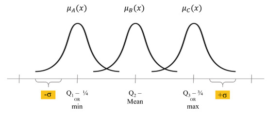 Finally, there is a problem of selecting the type of membership function to be estimated, and the study was conducted in consideration of the (1) Gaussian model, (2) Triangular model, and (3) Trapezoidal model, which are represented by the formulas specified below. The Gaussian model is a method of measuring the degree of each fuzzy set in the form of a normal distribution and is expressed as a normal distribution equation as shown in Equation (1). The triangular model literally represents each fuzzy membership in a triangular shape, and the trapezoidal model represents a trapezoidal shape. These two types can be used when the distribution of data is uneven or contains discrete features, can be used to increase accuracy, and are expressed as equations representing straight lines for each section as in Equations (2) and (3). In this study, these models were appropriately selected and applied according to the characteristics of each feature.