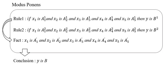 Algorithm 2 shows a series of processes that perform an appropriate response to the input traffic based on the characteristics of each traffic type analyzed from the viewpoint of actual network management. The process of obtaining the membership level by extracting the characteristics of the target traffic proceeds in the manner described in Algorithm 1. In the fuzzy inference engine, the product inference engine calculates a confidence value indicating the degree of conformity for each traffic type. The process of inferring the degree of conformity through the If–Then rule is shown in Figure 7, in which the whole case proceeds in a Modus Ponens manner. A schematic diagram of this process is shown in Figure 8, and Algorithm 2 takes place in the Traffic Recognition part of the figure.