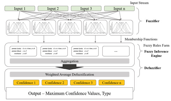We use the weighted average method that averages the conclusions obtained through inference for all rules as weights and is calculated as shown in Equation (6). The weighted average defuzzifier is known as a very efficient algorithm in terms of computing resources and time and is used in many places. The overall components and processing flow are shown in Figure 9.