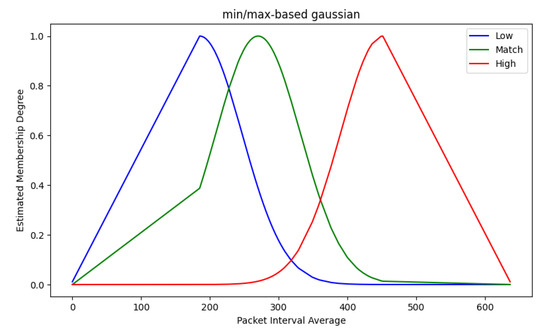 In order to confirm the performance level of the proposed algorithm, we conduct comparative analysis with the latest studies. Specifically, experiments were conducted with the same data for the K-means clustering algorithm, 1D CNN, 2D CNN, and DAGMM (Deep Autoencoding Gaussian Mixture Model). For the experiment, three types of fuzzy sets for each input feature were constructed: low, match, and high. The fuzzy membership function uses a method of defining a min–max average Gaussian model through a new technique that applies padding of 3 sigma. An example of the membership function composed of these settings is shown in Figure 10.