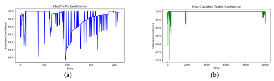 Confidence value trend of packets whose membership level is the maximum for chat type among all data. (a) shows the distribution of the actual chat type data. (b) shows the distribution of the misclassified data.