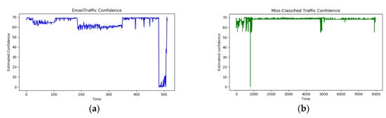 Confidence value trend of packets whose membership level is the highest for email type among all data. (a) shows the distribution of actual email type data. (b) shows the distribution of the misclassified data.