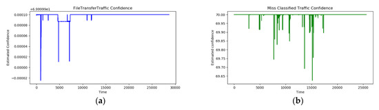 Confidence value trend of packets whose membership level is the maximum for the file transfer type among all data. (a) shows the distribution of actual file transfer type data. (b) shows the distribution of the misclassified data.
