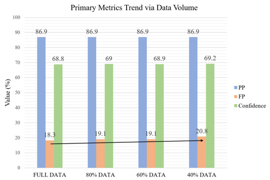 Accuracy trend according to the amount of learning traffic. Even when a small number of data including only the middle part of the total traffic flow is used, there is no change in positive-positive (PP) and Confidence, but there is a trend of increasing false-positive (FP) as shown by the arrow.