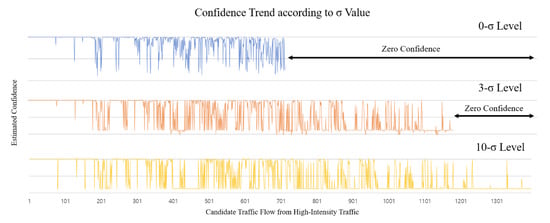 The padding method developed to create this advantage is determined as a multiple of the standard deviation and affects the actual recognition accuracy. To verify this, an additional experiment was conducted to examine the estimation result of the membership function that can be obtained through the change of the padding value. As shown in Figure 15, it can be seen that as the σ value increase, the number of data judged as the confidence-zero level changes.